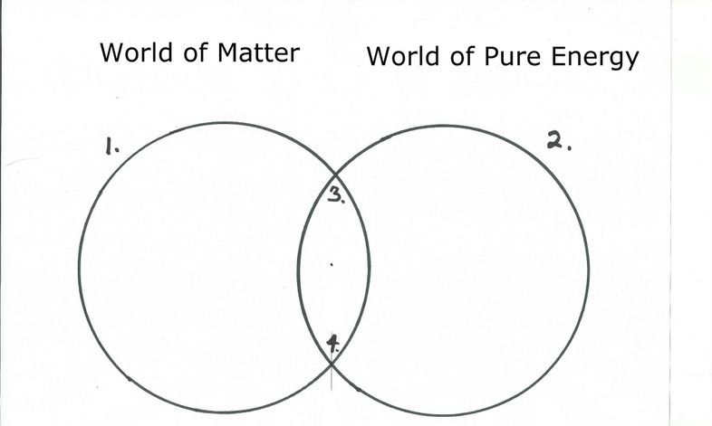 The dot in the middle of the Grand Operational Diagram would represent the ‘S’ shape and the circle found in this yin yang. It represents the unifying field that is a part of both the corporeal world and the quantum world. It is the force that holds the sides together. It is a field of many particles, not just a single particle. This is where it gets tricky to explain because in looking at particles, we are still dealing with a 'body' of sorts and therefore are still technically focused on the corporeal realm, the world of matter or of bodies. Quantum particle physics is still dealing with matter and has not yet considered or incorporated the idea of a world of pure energy; a world without body. The Grand Patchwork recognizes this and compensates for this conundrum by creating a new diagram. This theory is fluid and flexible and can unite both the corporal and the quantum worlds together by recognizing that a particle is still a type of body and must therefore also consider lumping together the corporeal and quantum worlds under the same category; that of the world of matter. So, here we are moving away from 1 and 2 representing Corporeal and Quantum, to representing the world of Matter and the world of Pure Energy (see below).