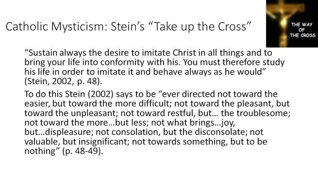 In the second stage, Stein says to take up the cross or “Sustain always the desire to imitate Christ in all things and to bring your life into conformity with his” (p. 48). Therefore, in order to do this one must “study his life in order to imitate it and behave always as he would. <<WWJD>>. Stein says to take up the cross which is to imitate Christ and to study his life, but says on the same page that this means to search out difficulty, unpleasantness, trouble and displeasure. She says to calm and order the natural passions of joy, hope, fear and sorrow. But, I am wondering where joy and hope come into a life of unpleasant difficult, troublesome displeasure, which strangely enough, doesn’t line up with what Christ would do or said to do. If one thoroughly studied and understood his life, there would be a different course of action involved.