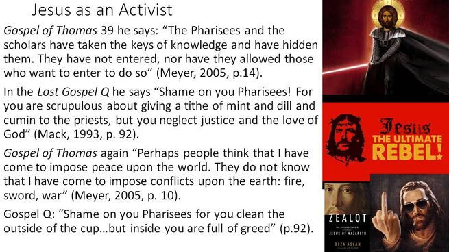 On his journey from place to place he challenged the status quo making him an activist. in the Gospel of Thomas 39 he says: “The Pharisees and the scholars have taken the keys of knowledge and have hidden them. They have not entered, nor have they allowed those who want to enter to do so” (Meyer, 2005, p.14). In the Gospel Q he says “Shame on you Pharisees! For you are scrupulous about giving a tithe of mint and dill and cumin to the priests, but you neglect justice and the love of God” (Mack p. 92). Gospel Q: “Shame on you Pharisees for you clean the outside of the cup…but inside you are full of greed” (p.92). <<I apologize for the one picture, let’s just chalk that up to the ‘Grand Mystery of personal freedom 😉>>.