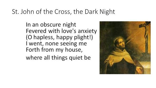The poem the Dark Night or the Dark Night of the Soul by St. John of the Cross is a story of a mystical journey.