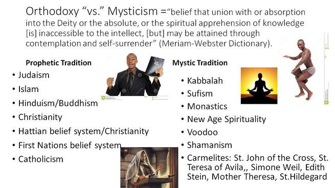 The dictionary definition of mysticism is up on the board. Mysticism takes many forms and it could be said that to any orthodox religion, there is a mystical sect. Judaism has Kabbalah, Islam has Sufism, monks meditating in Hindu and Buddhist temples practice the mystical aspect. Roughly, the difference between religious dogma and spiritual mysticism would be that religion is a group learning of how prophets or other notable figures have achieved oneness with the Creator, whereas mysticism is a personal, individual path or connection. The lines between them can be blurry, but basically one is more external whereas the other is more internal.