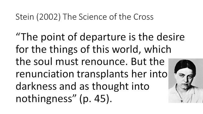 According to Edith Stein, the first point of departure is the detachment of the appetites of the material world [and] the desire for the things of this world, which the soul must renounce. But the renunciation transplants her into darkness and as thought into nothingness” (p. 45). The denial of the senses is called the ‘Passive Night’ and is consistent with the Bible as Luke 14:33 states “Whoever does not renounce all that the will possesses cannot be my disciple” (p. 47).
