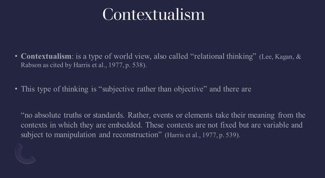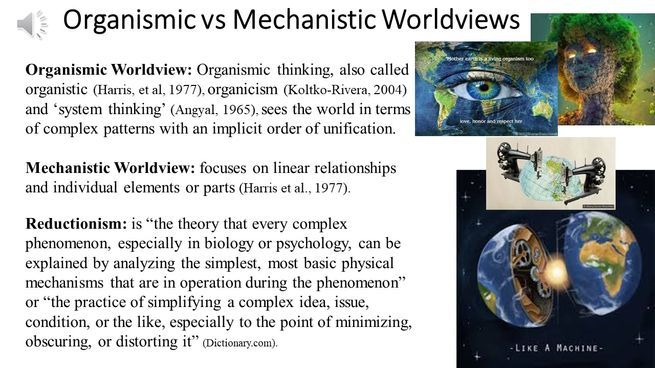 One’s worldview is one’s “philosophy of life” (Jung as cited in Koltko-Rivera, 2004, p. 4) and one’s worldview can influence one’s research and it can skew findings at every stage in the research process (Lincoln et al., 2011). The two major worldviews discussed here are that of a mechanistic worldview and an organismic worldview (Harris, et al., 1977; Koltko-Rivera, 2004). Organismic thinking, also called organistic (Harris, et al, 1977), organicism (Koltko-Rivera, 2004) and ‘system thinking’ (Angyal, 1965), sees the world in terms of complex patterns with an implicit order of unification. An organismic worldview, however, goes against traditional positivist understandings of reductionism that tend to produce a mechanistic worldview. A mechanistic worldview thus focuses on linear relationships and individual elements or parts (Harris et al., 1977). In this worldview, the sum of the parts is assumed to equal the whole. This is called reductionism, which is “the theory that every complex phenomenon, especially in biology or psychology, can be explained by analyzing the simplest, most basic physical mechanisms or “the practice of simplifying a complex idea, issue, condition, or the like, especially to the point of minimizing, obscuring, or distorting it” (Dictionary.com).