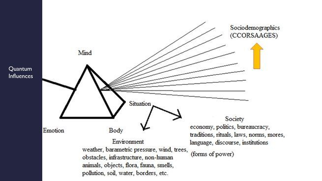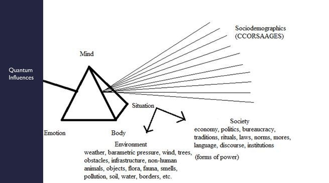 If there is a third force of time in the person-environment dichotomy, then the number three comes back into play (space, time and gravity = 3). The situation is an important third force; it reminds us of spontaneity and what it means to be alive. It is the situation that determines what an appropriate course of action is and what is not. It is also the most important because it is the most real. Ontologically speaking, out of the three (past, present and future) the present is the most real because it is where you are right now, so get in the flow. For example a lot of people spend their day thinking about what happened in the past or planning their future, like what they are going to have for dinner. The now is where one should be to really feel alive and connected. This is where your antenna is located (see Part 1).