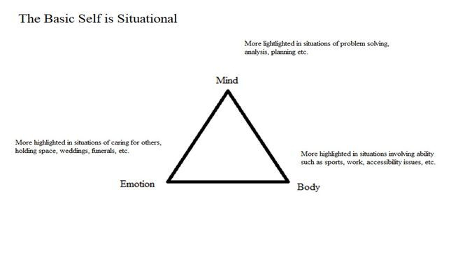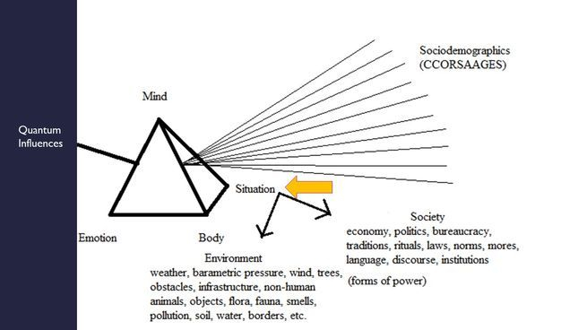 The situation works as a code or format that mediates between the body and the environment and because it mediates or translates. The communication between these two forces is forced into the parameters it demands at that time. In one situation an action may be completely absurd, but in another that action may be the most appropriate. After the body makes communication with the world, and the world communicates back, it communicates with the triangle as a system (you).