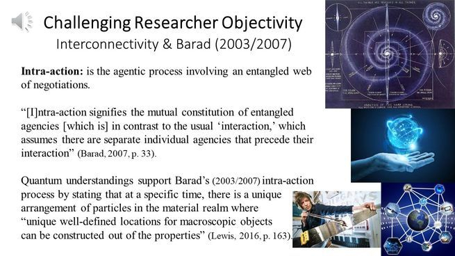 During the double-slit light experiments, an observer can affect whether or not the light will behave as a particle or a wave and “an observer can make that decision even after a photon has made its way almost completely through the experiment—seemingly well past the point at which it would become either a wave or a particle... thus proving the photon’s behavior isn’t predetermined” (Cho, 2017, para 3). Like how Barad’s (2007) objects are not prediscursive. Buks et al. (1998) found the more an observer watched, the more influence they had over what manifested. The measurement problem in quantum physics therefore complicates researcher objectivity because an observer can manipulate the outcome of these experiments and control whether light will manifest as a particle or a wave (Bohm, 1952; Cho, 2017; Kocsis et al., 2011). This shows that humans, including children, are co-producers of life (Barad, 2003/2007; Cho, 2017).