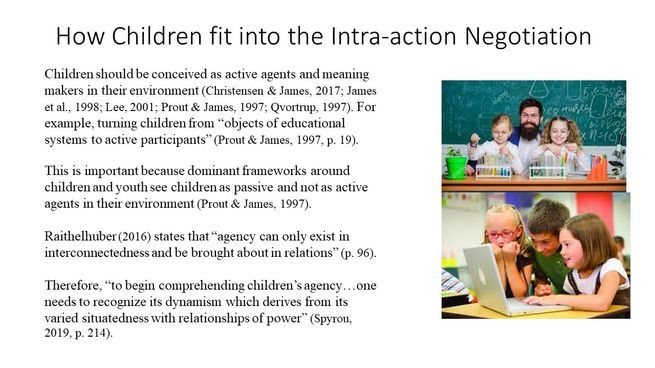 Quantum physics reveals an interconnected world (Barad, 2007; Bohm, 1952; Fetzer Memorial Trust & Howard, 2020; Pycroft & Bartollas, 2014) and proves true researcher objectivity cannot occur. According to the many-worlds interpretation, the process is considered most real because the outcome of this process determines which events, phenomena, and choice become manifest. Barad (2003/2007) discusses the importance of dynamic processes in her concept of intra-action. Intra-action is the agentic process involving an entangled web of negotiations. She states that “intra-action signifies the mutual constitution of entangled agencies [which is] in contrast to the usual ‘interaction,’ which assumes there are separate individual agencies that precede their interaction” (Barad, 2007, p. 33). Within the intra-action process, all things, humans, and objects are entangled and are active players in the meta-negotiation of agency and choice. This means that not only the researcher), and the children participants are co-creators, but also the non-human elements or apparatuses used in the research process (Barad, 2003/2007; Cho, 2017).