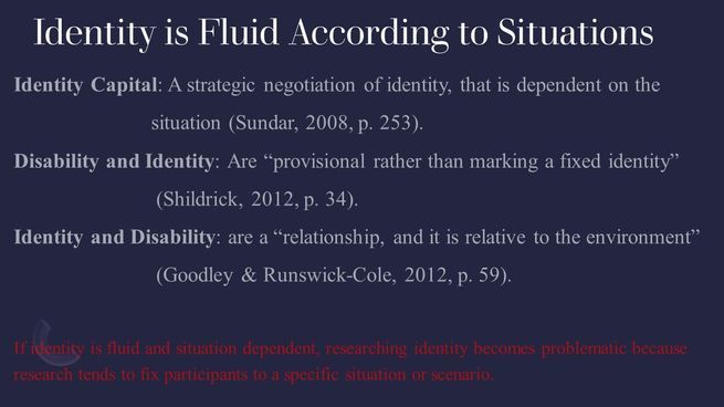These aspects, of course, are important to identity and identity formation. Stressing the dynamic aspect of the diagram, the situation also has power over the negotiation of identity because these characteristics also may vary in salience depending on the situation. (SLIDE) For example, Sundar (2008) discusses “identity capital” (p. 253) which is a strategic negotiation of identity, that is dependent on the situation. In her interviews with Asian-Canadian youth, in some situations, like in a dominant, mainstream setting, it was strategic to “bring down the brown'' to gain social acceptance, but in other situations, like a family wedding, it was better to “brown it up” (Sundar, 2008, p. 265). This research shows that identity is fluid. Therefore, negotiating identity via the situation, one can gain the most out of whatever situation they are in, showing the complementarity of identity and the situation. Not antagonism.