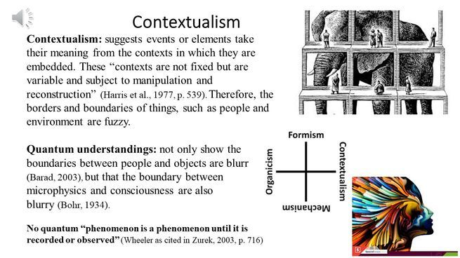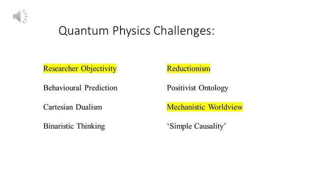 Quantum theories confuse reductionistic, simple, fixed categories because “realistic quantum systems are never isolated but are immersed in the surrounding environment and interact continuously with it” (Schlosshauer, 2004, p. 1268). According to String Theory: