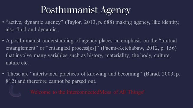 Regarding agency, posthumanist research discusses an “active, dynamic agency” (Taylor, 2013, p. 688) making agency, like identity, also fluid and dynamic. A posthumanist understanding of agency places an emphasis on the “mutual entanglement” or “entangled process[es]” (Pacini-Ketchabaw, 2012, p. 156) that involve many variables such as history, materiality, the body, culture, nature etc. These are “intertwined practices of knowing and becoming” (Barad, 2003, p. 812) and cannot be parsed out. Therefore, identity and agency are fluid, dynamic and a compounded part of the InterconnectedMess of all things. Thank you.
