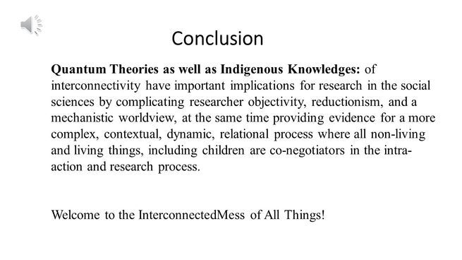 To incorporate quantum understandings into research, the role of the researcher, the processes behind the phenomena, and the context are important. When conducting research in the social sciences we must acknowledge the self as an interconnected participant within a process, not an objective observer. Barad (2003) says the world is in a state of becoming or an “ongoing open process” (p. 817) and things are not “things in themselves” or independent, stand-alone objects” (p. 817). The idea that humans are interconnected with the universe and are not objective observers may be a new concept for positivist research in the social sciences but is not new to Indigenous beliefs that have long understood the world to be cyclical, reciprocal, relational, and interconnected.