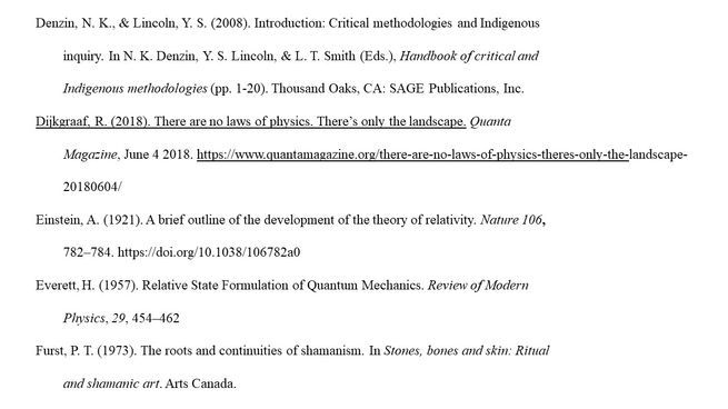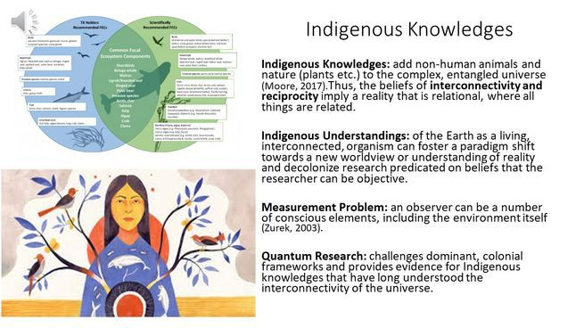 Indigenous “paradigm comes from the fundamental belief that knowledge is relational” (Wilson, 2008, p. 56). For example, the Maori peoples of New Zealand’s worldview is based on the principle of Whakapapa which “turns the universe into a moral space where all things great and small are interconnected, including science and research” (Denzin & Lincoln, 2008, p. 11). Similarly, Mi’kmaq “teachings are based on the interconnectedness of all things” (Marshall as cited in Moore, 2017, p. 24). These understandings see human beings as interconnected with the living and non-living and immersed in many relations and connections (Chilisa & Kawulich, 2012). Indigenous knowledges therefore have interesting implications for the measurement problem because even if there are no humans observing phenomena, any number of conscious elements such as non-human animals and plants can be considered an observer, even the environment itself (Zurek, 2003). Therefore, the environment as a personified observer can explain quantum contradictions of how elements remain intact and manifest, even when we humans are not observing.
