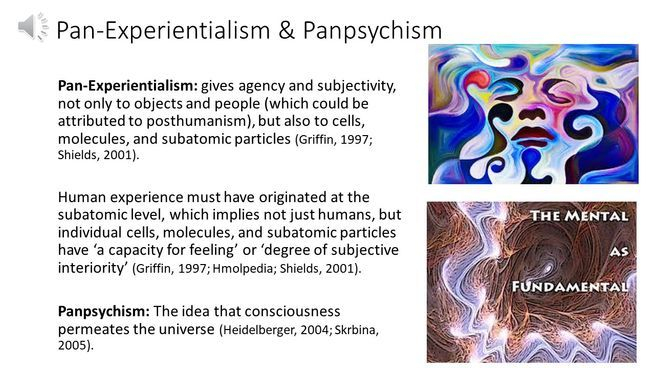 Pan-experientialism/panpsychism. A pan-experientialist approach gives agency and subjectivity, not only to objects and people but also to cells, molecules, and subatomic particles (Griffin, 1997; Shields, 2001). This stance believes human experience must have originated at the subatomic level, which implies not just humans, but individual cells, molecules, and subatomic particles have ‘a capacity for feeling’ or ‘degree of subjective interiority’ (Griffin, 1997; Hmolpedia; Shields, 2001). This paper not only recognizes a ubiquitous property of emotional and experiential elements but also adds a conscious component to cells, molecules, and subatomic particles. The idea that consciousness permeates the universe is called panpsychism (Heidelberger, 2004; Skrbina, 2005). If we can conceive of the universe as an interconnected, living, conscious agent, rather than seeing the universe as hierarchically arranged, then unequal power imbalances could be diffused. This can be extremely helpful when conducting research with children because they can be seen as equal, conscious, co-collaborating agents in the research process.