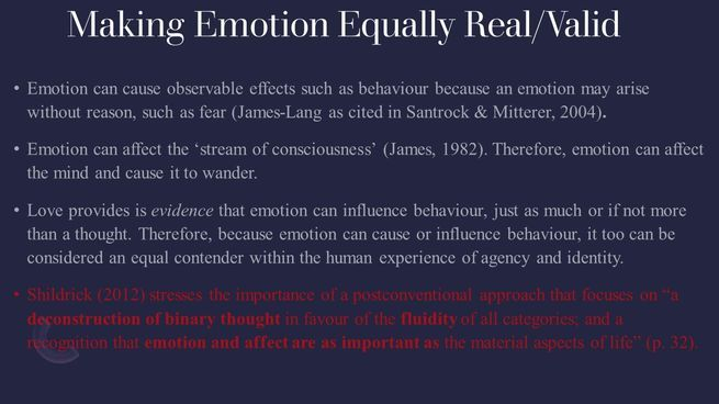 An emotion can have its own influence on behaviour or “cause” behaviour because an emotion may arise without reason, such as fear (James-Lang as cited by Mitterer, 2004). This can influence behaviour because an individual may start running (the mind coming up last again). Emotion can have its own influence over the mind because an emotion can arise without reason and can change the focus of thought to appraising the emotion and why it is being felt, thus affecting the “stream of consciousness” (William James). Perhaps the force of emotion is real (also see Biopsychosocial model of health).