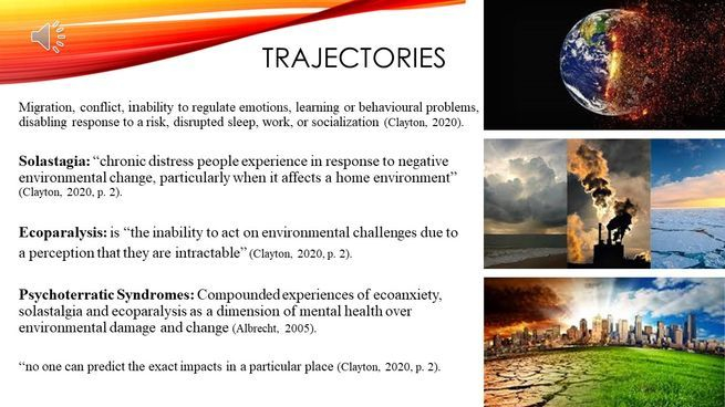 Some trajectories or pathways climate anxiety can take include increases in migration and conflict (Clayton, 2020, p. 1). People may be forced to leave their homes not just from natural disasters, but from the effect of climate change such as “rising sea levels, thawing permafrost, melting glaciers, or desertification” (p. 1). For example, there are “significant levels of drought threatening the Great Barrier Reef… and wildfires [have] threatened communities and killed enormous numbers of iconic animals” in Australia (Clayton, 2020, p. 2). Migrating to different places can be very stressful, especially when moving to a different country. This can come with economic challenges and social conflict, especially if they are not welcomed by the new community, both of which are threats to mental health (Clayton, 2020). Clayton (2020) discusses how the home can facilitate resilience and when it is taken away, especially involuntarily, it can “threaten mental health” (p. 1). Solastagia, is a term used to “describe the chronic distress people experience in response to negative environmental change, particularly when it affects a home environment” (Clayton, 2020, p. 2).
