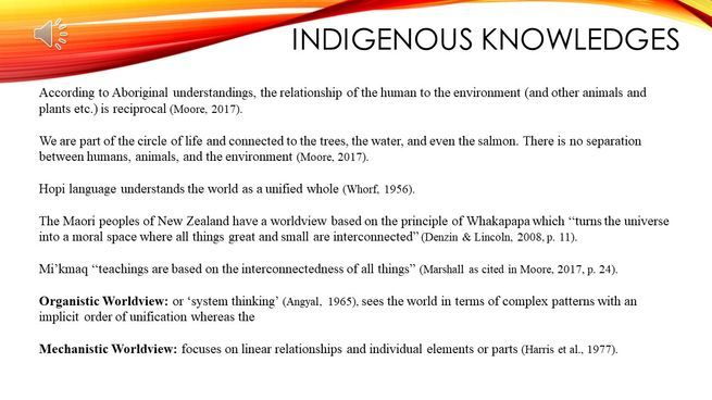 Aboriginal languages, such as the Hopi language do not set up the world to be in binaries, but rather, through their language, see the world as a unified whole (Whorf, 1956). For example, in the Hopi language, the same word for apple also means tree, and also means decay, capturing the cyclical motion of life (Whorf, 1956). The Maori peoples of New Zealand have a worldview based on the principle of Whakapapa which “turns the universe into a moral space where all things great and small are interconnected” (Denzin & Lincoln, 2008, p. 11). Similarly, Mi’kmaq “teachings are based on the interconnectedness of all things” (Marshall as cited in Moore, 2017, p. 24). These understandings see human beings as interconnected with the living world and therefore are emersed in many relations and connections (Chilisa & Kawulich, 2012).