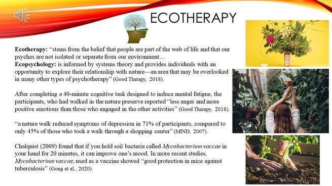 Similar to indigenous understandings, “Ecotherapy…stems from the belief that people are part of the web of life and that our psyches are not isolated or separate from our environment. Ecopsychology is informed by systems theory and provides individuals with an opportunity to explore their relationship with nature—an area that may be overlooked in many other types of psychotherapy” (Good Therapy, 2018). Research shows after completing a 40-minute cognitive task designed to induce mental fatigue, the participants, who had walked in the nature preserve reported “less anger and more positive emotions than those who engaged in the other activities” (Good Therapy, 2018). An experiential example from someone who went through Ecotherapy reports, “I remember walking into the garden, and I immediately felt better…There was food growing, and flowers. It really helped to shift my thinking” (Smith as cited in Hamblin, 2015). In another study “a nature walk reduced symptoms of depression in 71% of participants, compared to only 45% of those who took a walk through a shopping center” (MIND, 2007). Chalquist (2009) found that if you hold soil bacteria called Mycobacterium vaccae in your hand for 20 minutes, it can improve one’s mood. In more recent studies, Mycobacterium vaccae, has been suggested as a vaccine after showing “good protection in mice against tuberculosis” (Gong et al., 2020).