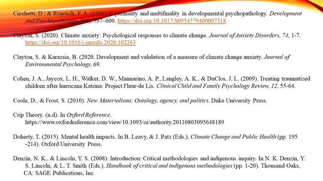 Research shows there is a “possibility for long-term and/or permanent effects of early experience of trauma which can impair children’s ability to regulate their own emotions and can lead to learning or behavioural problems” (p. 2). Early stress can also increase the risk of mental health problems later in life (Clayton, 2020, p. 2). Doherty & Clayton (2011) found “intense emotions associated with observations of climate change effects worldwide and anxiety and uncertainty about the unprecedented scale of current and future risks” (p. 265).