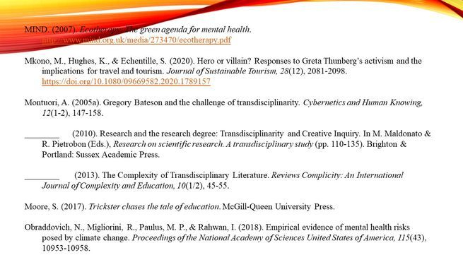 If negative reactions to climate change are not based on direct experience, mediators affecting the degree of anxiety are social context and/or media (Clayton, 2020, p. 3). Norgaard, (2006) notes that because attitudes towards climate change vary across cultures, to a degree, climate change is socially constructed. So, culture and context mediate the degree of distress. This is why research should focus on the “role of context in moderating [or mediating] the influence of individual differences on adaptive function and development” (p. 14). Therefore, a suggestion for future research, would be to focus more on context and culture as a way to mitigate perceptions around climate change and anxiety.