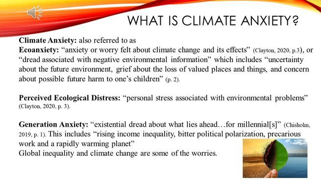 Climate Anxiety, also referred to as Ecoanxiety is “anxiety or worry felt about climate change and its effects” (Clayton, 2020, p.3), or “dread associated with negative environmental information” which includes “uncertainty about the future environment, grief about the loss of valued places and things, and concern about possible future harm to one’s children” (p. 2).