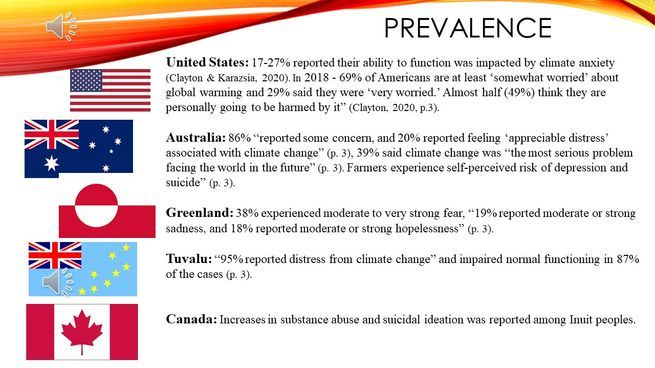 Australia. In Australia, 86% “reported some concern, and 20% reported feeling ‘appreciable distress’ associated with climate change” (p. 3). In this survey, 39% of the responders said that climate change was “the most serious problem facing the world in the future” (cited in Clayton, 2020, p. 3). Australian farmers experiencing climate change reported an increased self-perceived risk of depression and suicide” (p. 3). In Greenland a national survey reported that 38% experienced moderate to very strong fear, “19% reported moderate or strong sadness, and 18% reported moderate or strong hopelessness” (p. 3). In Tuvalu, an island nation experiencing noticeable effects of climate change, “95% reported distress from climate change” and impaired normal functioning in 87% of the cases (p. 3). In Canada increases in substance abuse and suicidal ideation was reported among Inuit peoples (p.3).