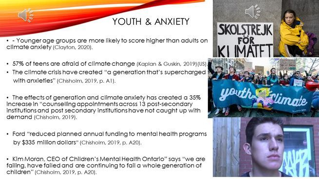 Younger adults “experience the strongest effects” and are more vulnerable when climate change is a direct experience. Young adults are more likely to score higher in climate anxiety than older adults (Clayton, 2020, p.2). When it comes to extreme weather events, children and youth have, on average, stronger responses such as sleep disorders, depression, and PTSD (Clayton, 2020). When weather events occur, children are more vulnerable because of their dependence on parents and the likelihood that social supports are disrupted are increased (Bartlett, 2008). In the US in 2019, Kaplan and Guskin found that “57% of teens said they were afraid of climate change (as cited in Clayton, 2020, p. 4). Younger adolescents and young adults think more about their future than older adults (Clayton, 2020) and this could be impacting the degree of anxiety experienced by younger aged groups. For example, the Toronto Star exclaims that issues such as the climate crisis have created “a generation that’s supercharged with anxieties” (Chisholm, 2019, p. A1). One student reports his experience of anxiety as being “strongest on my heart…a feeling I don’t know how to explain, but it’s like tight or very heavy” (Wang as cited in Chisholm, 2019, p. A21). The effects of generation and climate anxiety has created a 35% increase in “counselling appointments across 13 post-secondary institutions and post secondary institutions have not caught up with demand. Students are reporting extremely long wait times for counselling. This is why it is shocking to hear that Ford “reduced planned annual funding to mental health programs by $335 million dollars.” Kim Moran, CEO of Children’s Mental Health Ontario” says “we are failing, have failed, and are continuing to fail a whole generation of children (Chisholm, 2019, p. A20).