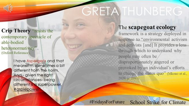 Greta is an interesting example in climate anxiety and mental health because her advocacy for a clean planet creates mixed emotions (Mkono et al., 2020). The scapegoat ecology framework is a strategy deployed in response to “environmental activism and activists [and] It provides a lens through which to understand why people may often be disproportionately angered or provoked by an individual’s efforts to change the status quo” (Mkono et al., 2020, p. 2081). Greta, therefore, gets some backlash in her efforts and her Asperger’s is wielded as a weapon against the credibility of her cause. However, Greta is an exemplary spokesperson for mental health and de-stigmatization of mental illness because she refers to her Asperger’s as a “superpower” (BBC). Linking this to Crip theory, the term ‘crip’ emerged in disability movements, as an adaptation and reworking of the derogatory word ‘crip**’ (Oxford Reference). In Crip theory, taking back the name in an attempt to transform it from its pejorative connotations is a way for those with disabilities to insert and exert their voice into mainstream consciousness in order to “resist the contemporary spectacle of able-bodied heteronormativity” (Oxford Reference). Like queer theory disrupts by ‘queering things up,’ crip theory ‘crips things up’ and challenges dominant frameworks of disability. The positive embracing of Asperger’s as a part of herself could be considered a protective factor for mental health.
