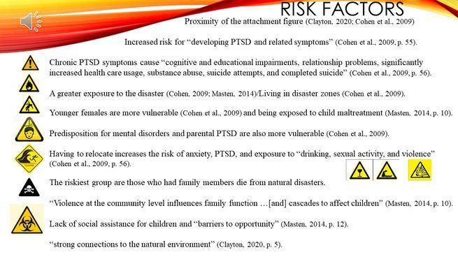Some risk factors involved in eco-anxiety and exposure to natural disasters are again, the proximity of the attachment figure because if they are not present, trauma is increased (Cohen et al., 2009). For example, one girl was separated from her mother after Hurricane Katrina hit because it was her father’s weekend. She reports the trauma of getting to a local stadium where aid was set up and wished she were with her mother (Cohen et al., 2009). Depression after an environmental disaster increases the risk for “developing PTSD and related symptoms” (Cohen et al., 2009, p. 55) and chronic PTSD symptoms cause “cognitive and educational impairments, relationship problems, significantly increased health care usage, substance abuse, suicide attempts, and completed suicide” (p. 56).
